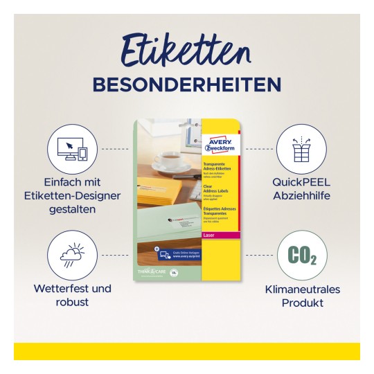 Οι διάφανες ετικέτες είναι άψογα προσαρμοσμένες στα κοινά μεγέθη φακέλων. Το μέγεθος 63,5 x 38,1mm αυτών των ετικετών είναι ιδιαίτερα κατάλληλο για φακέλους C6. Επίσης, το μέγεθος αυτό είναι ειδικά προσαρμοσμένο στο μέγεθος INTERNETMARKE της Deutsche Post. Έτσι μπορείτε να εκτυπώστε μόνοι σας τα ταχυδρομικά τέλη. Επιπλέον, χάρη στο καινοτόμο σύστημα αφαίρεσης ετικετών QuickPEEL μπορείτε να εφαρμόσετε τις ετικέτες ιδιαίτερα απλά και γρήγορα - μία καλαίσθητη αλλά και αποτελεσματική λύση!